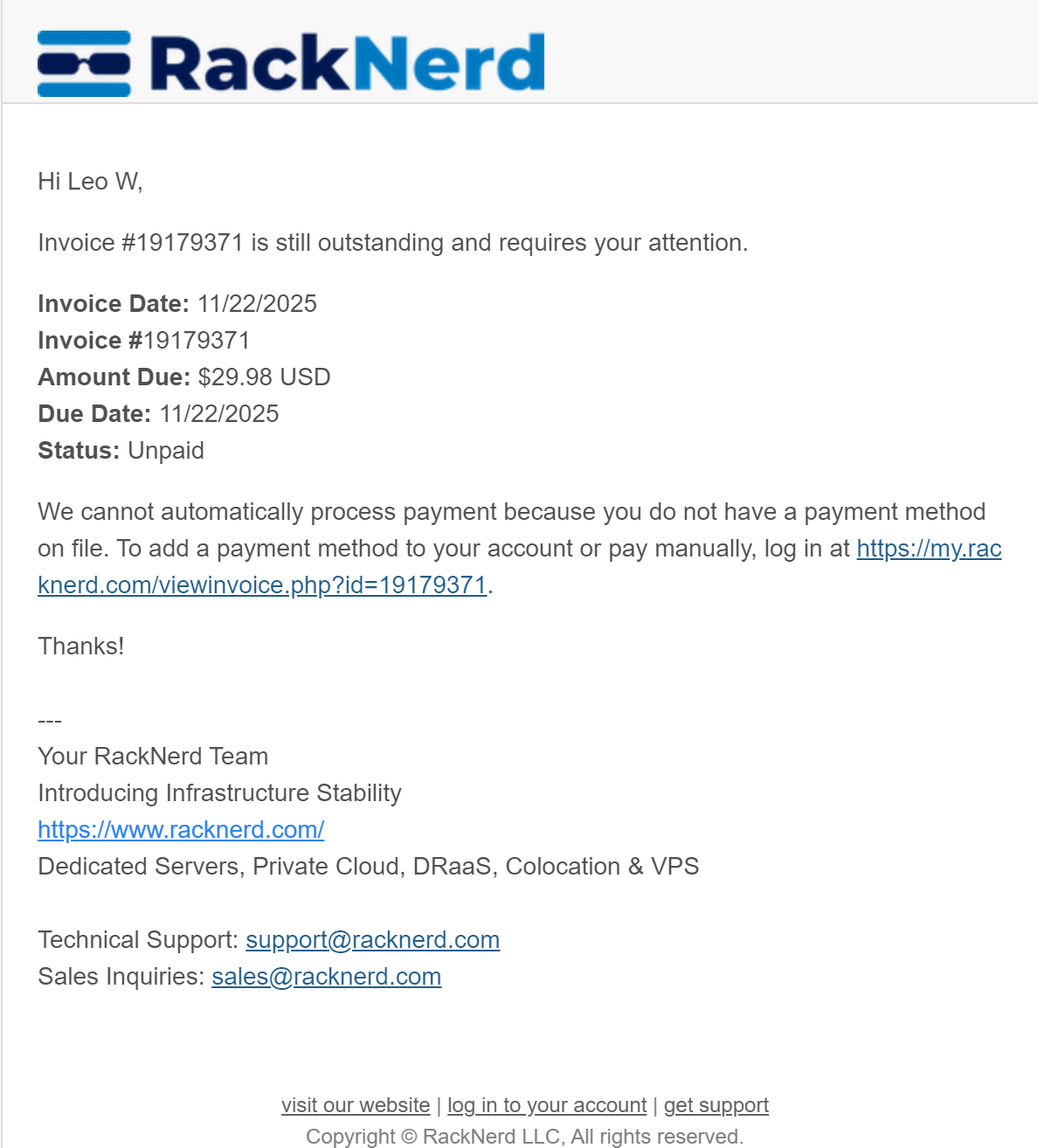 去年11月22日黑五期间,想整一台RN的小鸡,然后拿了优惠码去下单,因为付款问题没有支付成功,后来改买了国人的香港小鸡,那也就是说放弃了RN的这个单子。但是自从我去年11月22日下单后,从次日起,直到今天,RN一直给我发Invoice...
